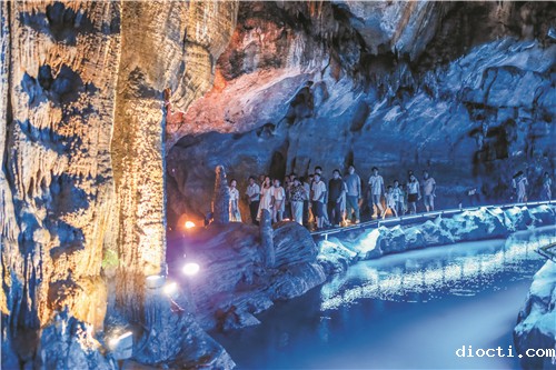 8月3日,宁远县紫霞岩景区内,游客在溶洞中观光避暑。炎炎夏日,该景区溶洞内流光溢彩,清凉宜人,吸引不少游客前来赏景避暑。 彭华 摄