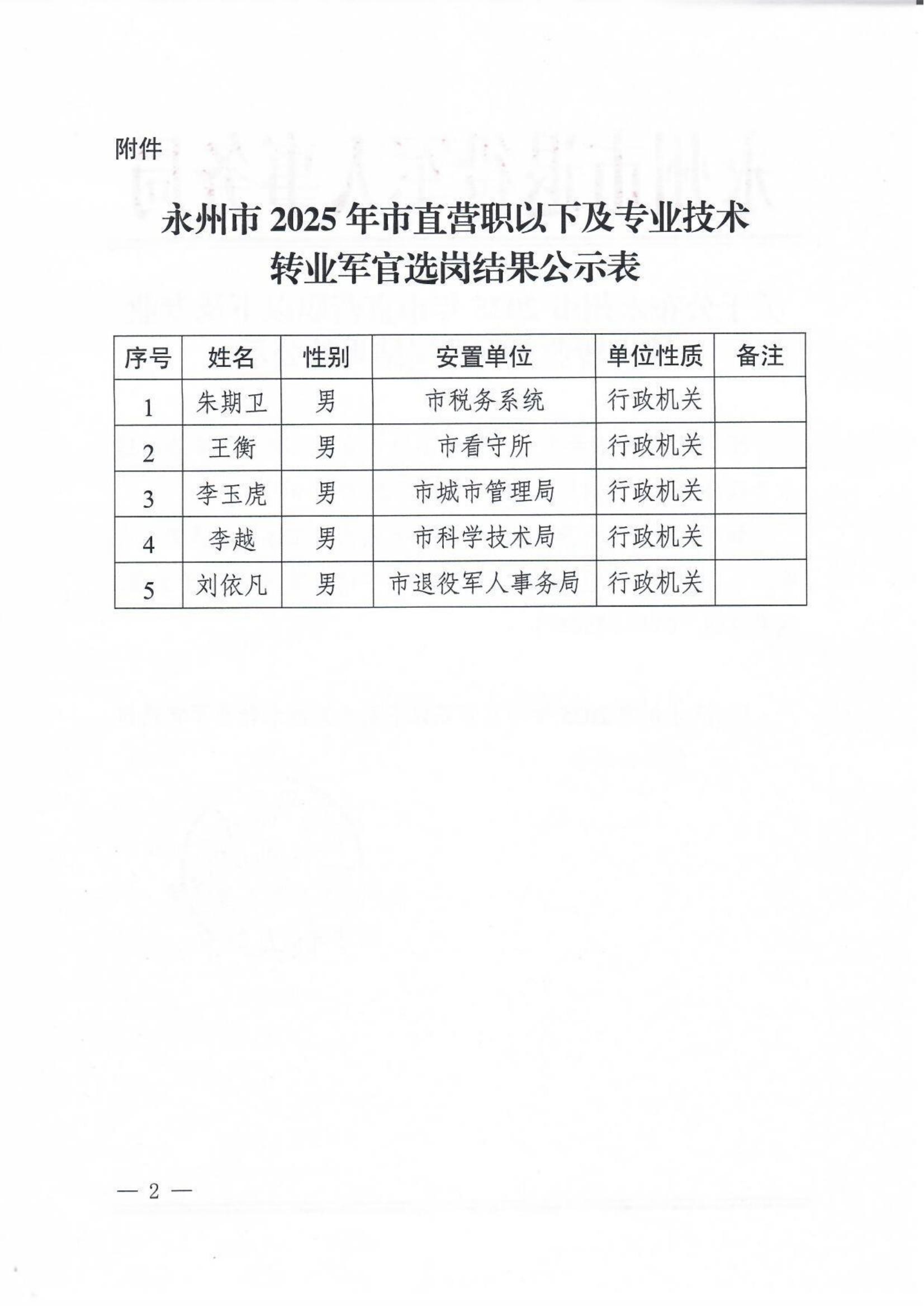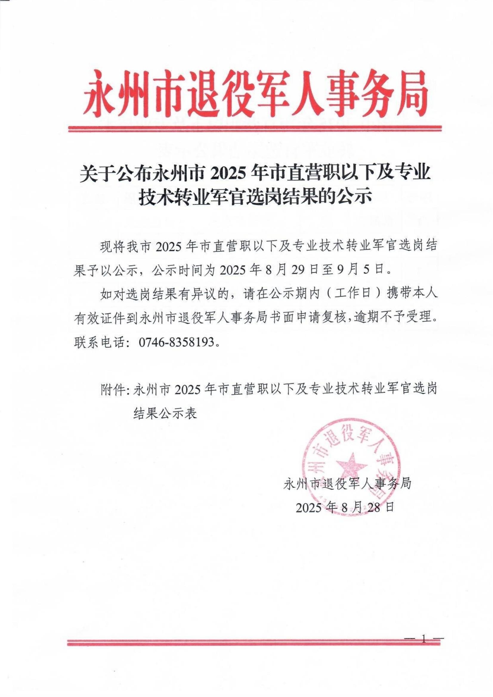 关于公布永州市 2025年市直营职以下及专业技术转业军官选岗结果的公示