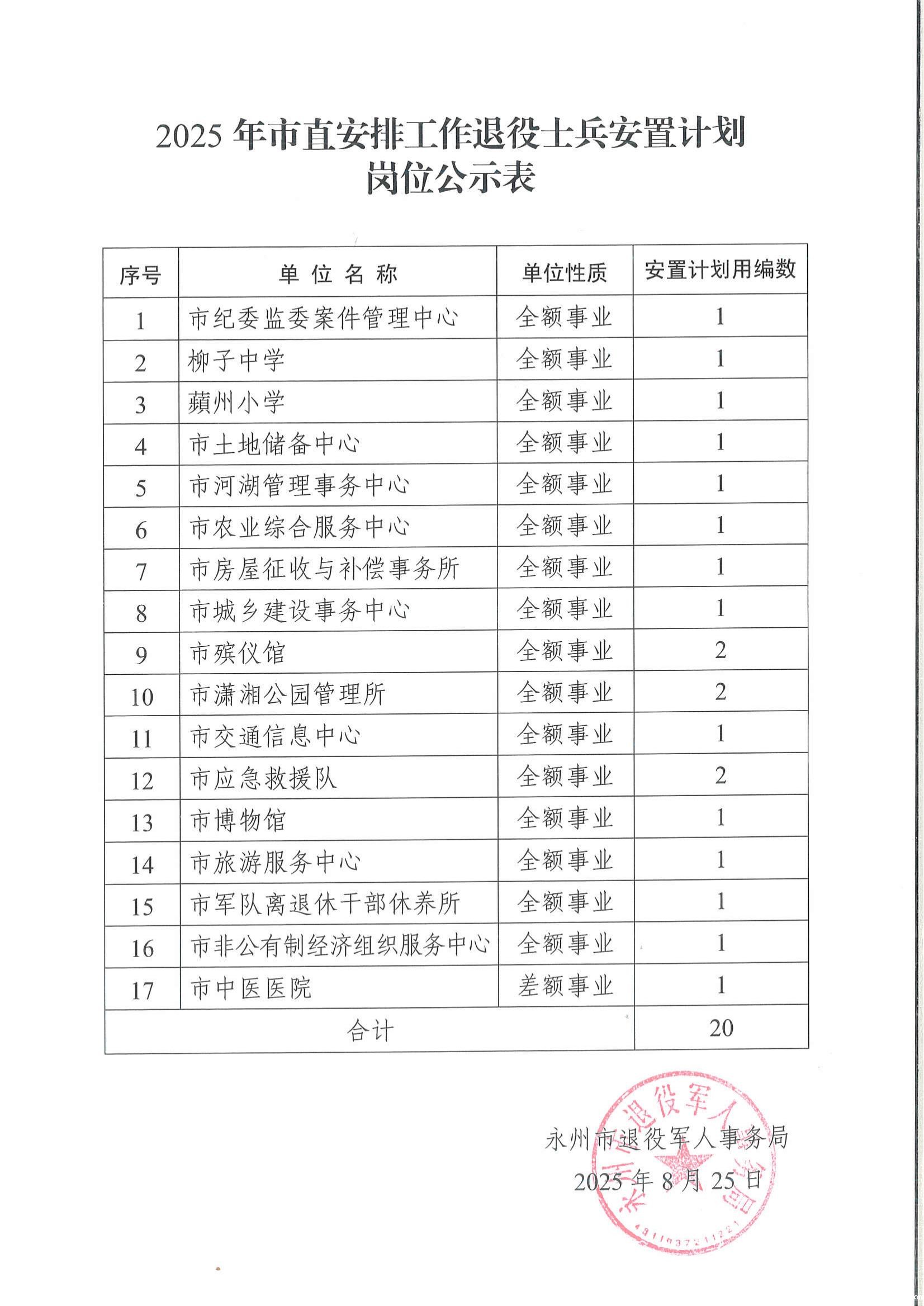 2025年市直安排工作退役士兵安置计划岗位公示表
